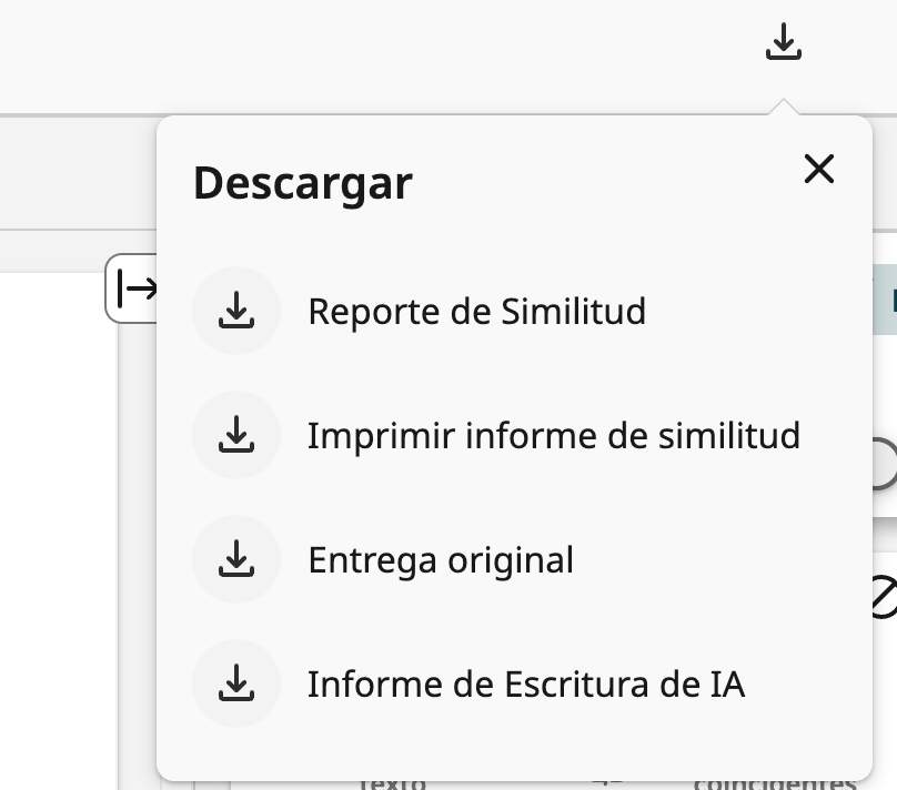 Una vez que la plataforma Turnitin haya evaluado el proyecto o informe de tesis a través de tu asesor -quien accede al servicio a través de su cuenta-, Turnitin ofrece (ver en la parte superior derecha de Turnitin estas opciones de descarga):